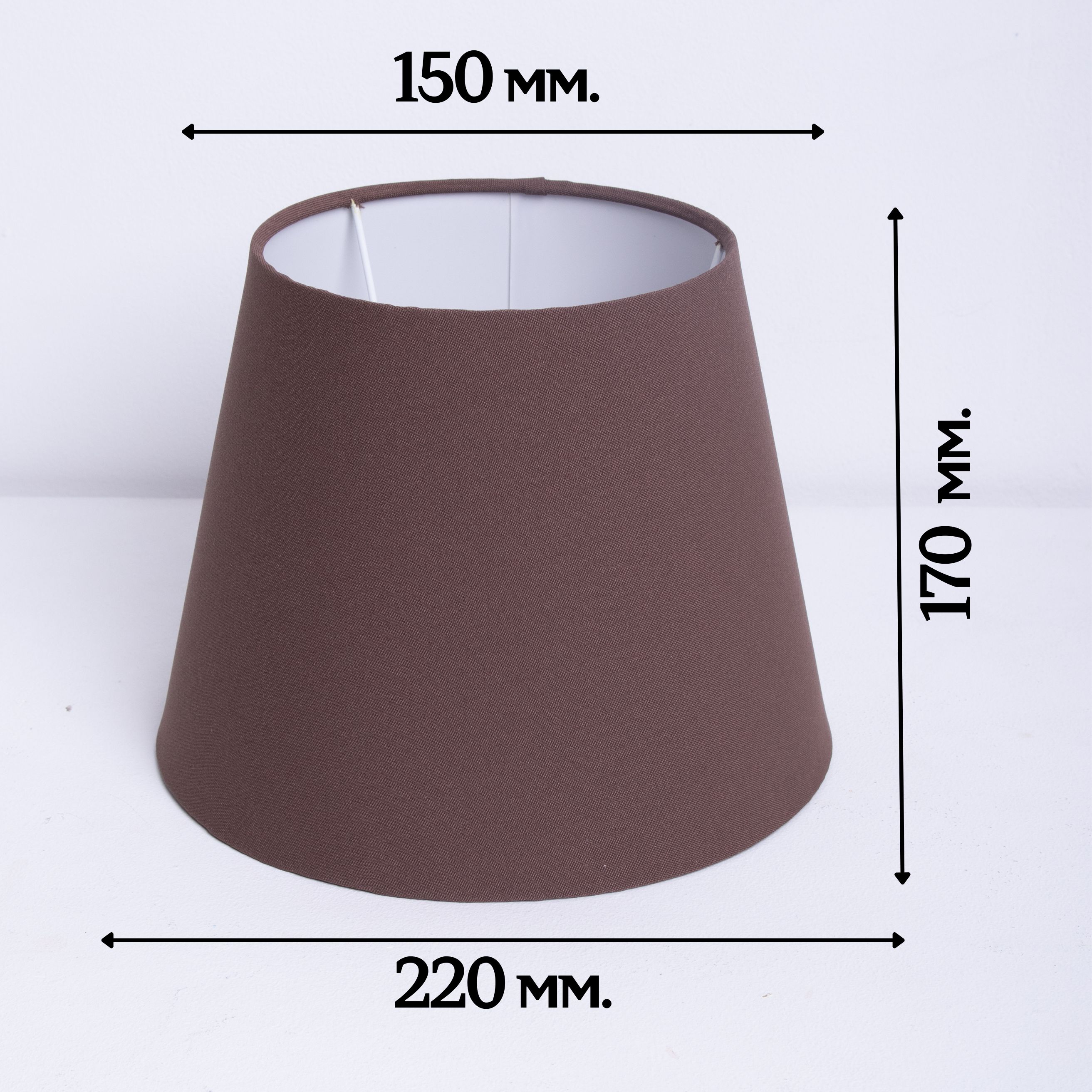 Классическая форма абажура – конус. Цвет: Кофе (шоколадный). Размеры абажура: Верхний диаметр – 150 мм, Нижний диаметр 220 мм, высота – 170 мм. Крепление для патрона Е27. Абажур отлично сядет как на напольные торшеры, так и на большинство настольных ламп. Светильники и абажуры под брендом Пермский Свет – это всегда изделия самого высокого качества. Мы не экономим на качестве и не идем по пути дешевых материалов. Все изделия создаются на нашей фабрике полностью вручную. Для наших изделий, мы используем только качественные ткани и материалы. Цвет ткани и ее качество подобраны со вкусом нашими дизайнерами. Легкий, универсальный цвет абажура отлично впишется в любой интерьер. Прочные стальные каркасы покрыты надежной порошковой краской. Правильно подобранный абажур будет отлично смотреться на Вашем основании и радовать Вас.