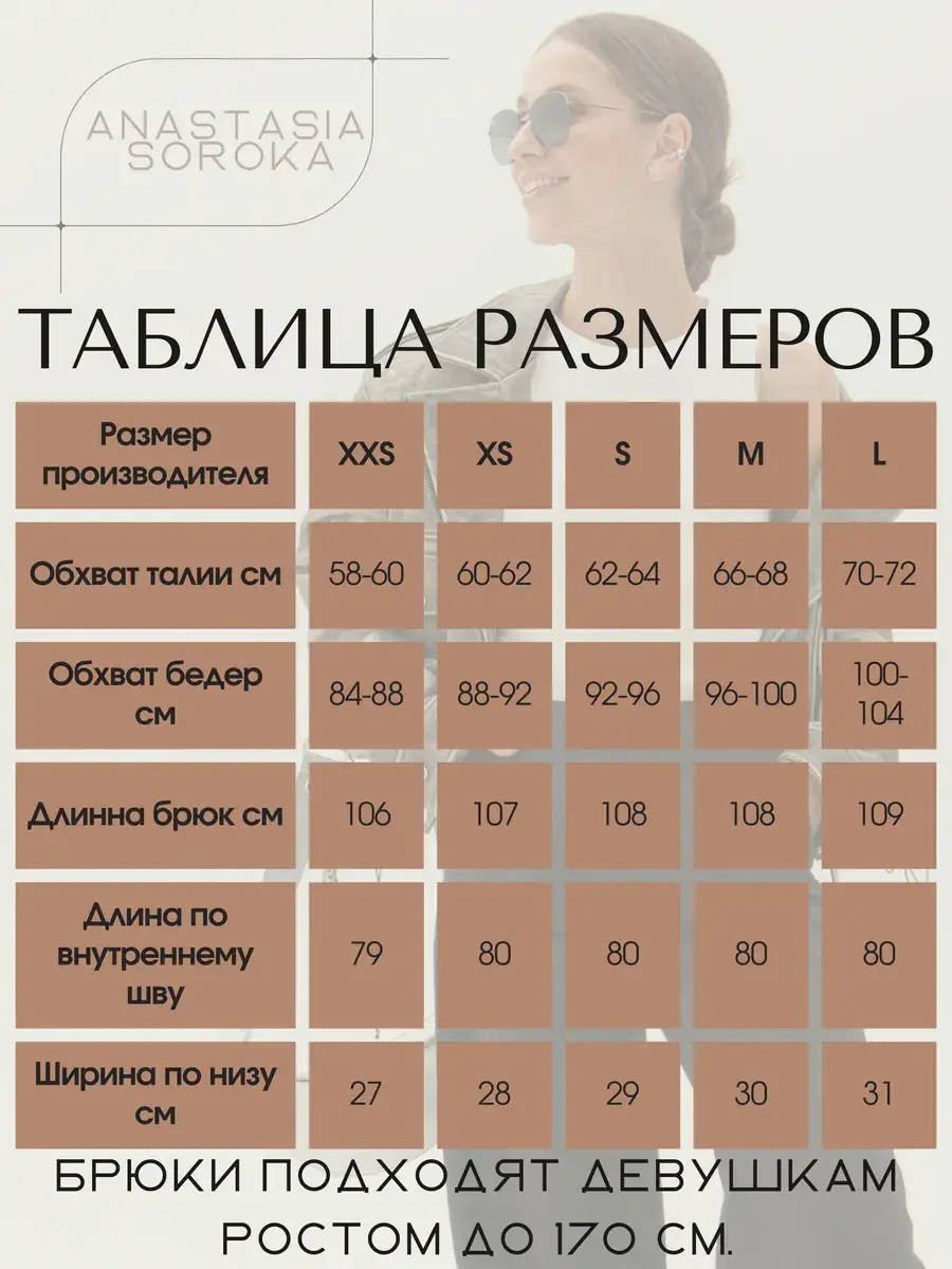 Стильные женские брюки палаццо бренда Anastasia Soroka - это идеальная одежда для офиса и вечерних выходов. Модель имеет эстетичную форму с широкими и прямыми штанинами, завышенной посадкой на талии и эластичной резинкой на поясе сзади. Наличие в коллекции разнообразных размеров делают брючки подходящими как взрослым женщинам, так и девушкам - подросткам любого роста и типа фигуры - высоким и невысоким, худым и с полными бедрами, а хороший выбор цветов позволяет подобрать вещь, идеально соответствующую вашим нуждам и вкусовым предпочтениям. Изделие выполнено из плотной и легкой ткани премиум - качества, в составе которой хлопок, полиэстер и эластан, что делает их оптимальными для ношения в теплое время года: весенний, летний и осенний сезоны. Красивый наряд поможет создать элегантный образ для вечеринки или фотосессии, а также трендовый и офисный лук и пройдет даже самый строгий дресс - код. Женственные штанишки со свободным кроем, прорезными боковыми карманами и защипами спереди станут самой модной и молодежной вещью в гардеробе каждой современной леди. Они сочетают в себе классику и тренды, подходят как на выпускной, так и на деловую встречу или просто для повседневного кэжуал - образа. Шикарные брюки актуальны как для нарядных и интересных луков, так и для неформальных образов. Вы сможете надеть их на танцы в клуб или семейный праздник, также они прекрасно подойдут для школьной формы.