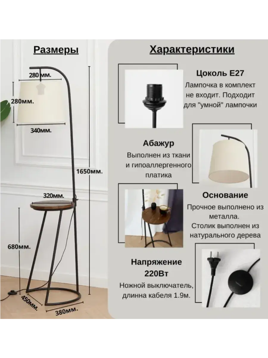 Стильный и современный торшер с лаконичным абажуром и высокой ножкой бренда Пермский свет идеально подойдет для вашей гостиной или спальни. Поможет создать уют, станет дополнительным источником освещения и просто красивым декоративным предметом в оформлении интерьера в вашем доме. Купите его как подарок для женщин и девушек на 8 Марта или украсьте свою комнату в стиле лофт или модерн с помощью этого красивого светильника. Изделие ручной работы выполнено на нашем собственном производстве - фабрике, осуществляющей строгий контроль качества на каждом этапе изготовления. Абажур торшера изготовлен из безопасных, экологически чистых и гипоаллергенных материалов: термостойкой светотехнической пленки российского производства и износостойкой ткани премиум-качества. Торшер имеет ножной выключатель на проводе с вилкой. Длина сетевого шнура 1,85 метра. Этот напольный светильник с классическим дизайном в черном цвете станет отличным декоративным элементом в вашем интерьере и подойдет и для мужской, и для женской комнаты. Его длинная изящная форма сделает его вашим любимым дополнением для домашнего оформления декора. Он оснащен простым и удобным управлением освещения с помощью переключателя с кнопкой, а его бежевый абажур из качественной ткани поможет создать уютную домашнюю атмосферу. Уникальная торшерная лампа с дизайнерским абажуром идеально подойдет для оформления интерьера в комнате в стиле минимализм или модерн. Ее основание из пластика и металла идеально сочетается с текстильным абажуром. Она выступает отличным дополнительным источником освещения во время чтения книг или занятия рукоделием. Это идеальный выбор для рабочего кабинета или детской комнаты в квартире. Установите ее у камина, дивана или кресла. Комнатное изделие также подходит для интерьерного оформления дачи. Изделие удобное и практичное для использования. Проводной светильник работает от сети питания и подключается в обычную розетку. Для него подойдут любые светодиодные лампочки с цоколем Е27 (приобретаются отдельно). Изделие станет отличным подарком вашим родным и друзьям: родителям - маме с папой или дедушке с бабушкой. У нас есть акции и распродажи, вы можете купить наши товары в подарок или со скидкой!