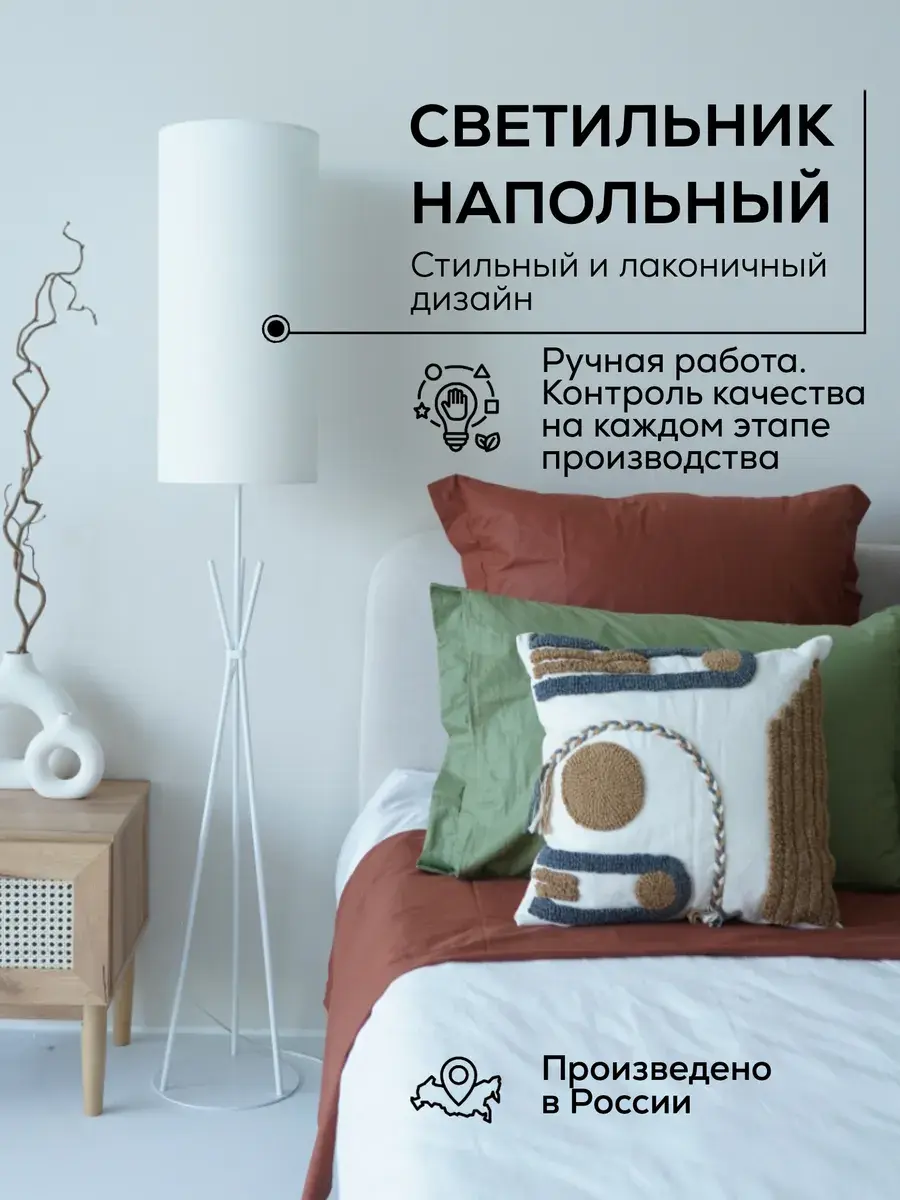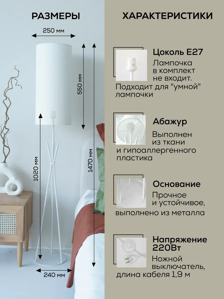 Стильный и современный торшер с лаконичным абажуром и высокими ножками бренда Пермский свет идеально подойдет для вашей гостиной или спальни. Поможет создать уют, станет дополнительным источником освещения и просто красивым декоративным предметом в оформлении интерьера в вашем доме. Купите его как подарок для женщин и девушек на 8 Марта или украсьте свою комнату в стиле лофт или модерн с помощью этого красивого светильника. Изделие ручной работы выполнено на нашем собственном производстве - фабрике, осуществляющей строгий контроль качества на каждом этапе изготовления. Абажур торшера изготовлен из безопасных, экологически чистых и гипоаллергенных материалов: термостойкой светотехнической пленки российского производства и износостойкой ткани премиум-качества. Торшер имеет ножной выключатель на проводе с вилкой. Длина сетевого шнура 1,9 метра. Этот напольный светильник с классическим дизайном в белом цвете станет отличным декоративным элементом в вашем интерьере и подойдет и для мужской, и для женской комнаты. Его длинная изящная форма сделает его вашим любимым дополнением для домашнего оформления декора. Он оснащен простым и удобным управлением освещения с помощью переключателя с кнопкой, а его белый абажур из качественной ткани поможет создать уютную домашнюю атмосферу. Уникальная торшерная лампа с дизайнерским абажуром идеально подойдет для оформления интерьера в комнате в стиле минимализм или модерн. Ее основание из пластика и металла идеально сочетается с текстильным абажуром. Она выступает отличным дополнительным источником освещения во время чтения книг или занятия рукоделием. Это идеальный выбор для рабочего кабинета или детской комнаты в квартире. Установите ее у камина, дивана или кресла. Комнатное изделие также подходит для интерьерного оформления дачи. Изделие удобное и практичное для использования. Модель тренога - это настоящая классика, которая станет украшением любого помещения. Проводной светильник работает от сети питания и подключается в обычную розетку. Для него подойдут любые светодиодные лампочки с цоколем Е27 (приобретаются отдельно). Изделие станет отличным подарком вашим родным и друзьям: родителям - маме с папой или дедушке с бабушкой. У нас есть акции и распродажи, вы можете купить наши товары в подарок или со скидкой!