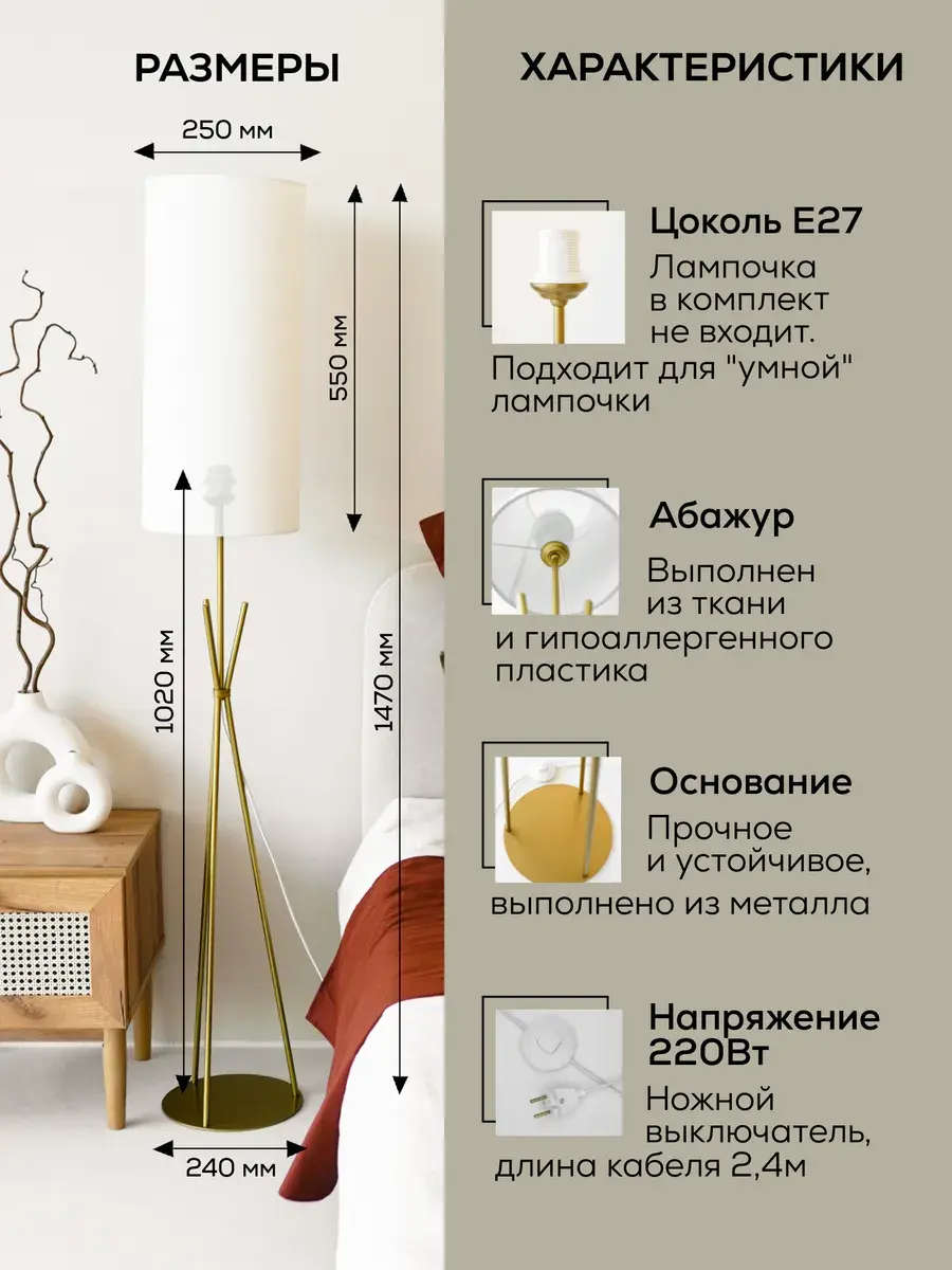 Стильный и современный торшер с лаконичным абажуром и высокими ножками бренда Пермский свет идеально подойдет для вашей гостиной или спальни. Поможет создать уют, станет дополнительным источником освещения и просто красивым декоративным предметом в оформлении интерьера в вашем доме. Купите его как подарок для женщин и девушек на 8 Марта или украсьте свою комнату в стиле лофт или модерн с помощью этого красивого светильника. Изделие ручной работы выполнено на нашем собственном производстве - фабрике, осуществляющей строгий контроль качества на каждом этапе изготовления. Абажур торшера изготовлен из безопасных, экологически чистых и гипоаллергенных материалов: термостойкой светотехнической пленки российского производства и износостойкой ткани премиум-качества. Торшер имеет ножной выключатель на проводе с вилкой. Длина сетевого шнура 1,9 метра. Этот напольный светильник с классическим дизайном в золотом цвете станет отличным декоративным элементом в вашем интерьере и подойдет и для мужской, и для женской комнаты. Его длинная изящная форма сделает его вашим любимым дополнением для домашнего оформления декора. Он оснащен простым и удобным управлением освещения с помощью переключателя с кнопкой, а его белый абажур из качественной ткани поможет создать уютную домашнюю атмосферу. Уникальная торшерная лампа с дизайнерским абажуром идеально подойдет для оформления интерьера в комнате в стиле минимализм или модерн. Ее основание из пластика и металла идеально сочетается с текстильным абажуром. Она выступает отличным дополнительным источником освещения во время чтения книг или занятия рукоделием. Это идеальный выбор для рабочего кабинета или детской комнаты в квартире. Установите ее у камина, дивана или кресла. Комнатное изделие также подходит для интерьерного оформления дачи. Изделие удобное и практичное для использования. Модель тренога - это настоящая классика, которая станет украшением любого помещения. Проводной светильник работает от сети питания и подключается в обычную розетку. Для него подойдут любые светодиодные лампочки с цоколем Е27 (приобретаются отдельно). Изделие станет отличным подарком вашим родным и друзьям: родителям - маме с папой или дедушке с бабушкой. У нас есть акции и распродажи, вы можете купить наши товары в подарок или со скидкой!