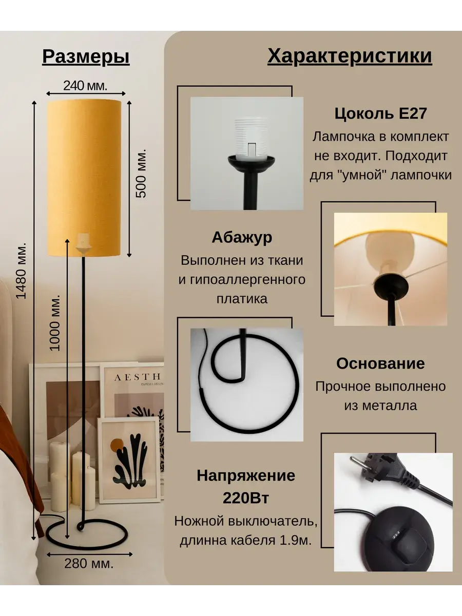Стильный и современный торшер с лаконичным абажуром и высокими ножками бренда Пермский свет идеально подойдет для вашей гостиной или спальни. Поможет создать уют, станет дополнительным источником освещения и просто красивым декоративным предметом в оформлении интерьера в вашем доме. Купите его как подарок для женщин и девушек на 8 Марта или украсьте свою комнату в стиле лофт или модерн с помощью этого красивого светильника. Изделие ручной работы выполнено на нашем собственном производстве - фабрике, осуществляющей строгий контроль качества на каждом этапе изготовления. Абажур торшера изготовлен из безопасных, экологически чистых и гипоаллергенных материалов: термостойкой светотехнической пленки российского производства и износостойкой ткани премиум-качества. Торшер имеет ножной выключатель на проводе с вилкой. Длина сетевого шнура 1,9 метра. Этот напольный светильник с классическим дизайном в горчичном цвете станет отличным декоративным элементом в вашем интерьере и подойдет и для мужской, и для женской комнаты. Его длинная изящная форма сделает его вашим любимым дополнением для домашнего оформления декора. Он оснащен простым и удобным управлением освещения с помощью переключателя с кнопкой, а его абажур из качественной ткани поможет создать уютную домашнюю атмосферу. Уникальная торшерная лампа с дизайнерским абажуром идеально подойдет для оформления интерьера в комнате в стиле минимализм или модерн. Ее основание из пластика и металла идеально сочетается с текстильным абажуром. Она выступает отличным дополнительным источником освещения во время чтения книг или занятия рукоделием. Это идеальный выбор для рабочего кабинета или детской комнаты в квартире. Установите ее у камина, дивана или кресла. Комнатное изделие также подходит для интерьерного оформления дачи. Изделие удобное и практичное для использования. Модель тренога - это настоящая классика, которая станет украшением любого помещения. Проводной светильник работает от сети питания и подключается в обычную розетку. Для него подойдут любые светодиодные лампочки с цоколем Е27 (приобретаются отдельно). Изделие станет отличным подарком вашим родным и друзьям: родителям - маме с папой или дедушке с бабушкой. У нас есть акции и распродажи, вы можете купить наши товары в подарок или со скидкой!