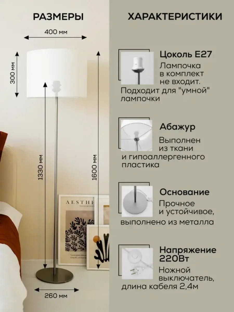 Стильный и современный торшер с лаконичным абажуром и высокой ножкой бренда Пермский свет идеально подойдет для вашей гостиной или спальни. Поможет создать уют, станет дополнительным источником освещения и просто красивым декоративным предметом в оформлении интерьера в вашем доме. Купите его как подарок для женщин и девушек на 8 Марта или украсьте свою комнату в стиле лофт или модерн с помощью этого красивого светильника. Изделие ручной работы выполнено на нашем собственном производстве - фабрике, осуществляющей строгий контроль качества на каждом этапе изготовления. Абажур торшера изготовлен из безопасных, экологически чистых и гипоаллергенных материалов: термостойкой светотехнической пленки российского производства и износостойкой ткани премиум-качества. Торшер имеет ножной выключатель на проводе с вилкой. Длина сетевого шнура 2,4 метра. Этот напольный светильник с классическим дизайном в серебристом цвете станет отличным декоративным элементом в вашем интерьере и подойдет и для мужской, и для женской комнаты. Его длинная изящная форма сделает его вашим любимым дополнением для домашнего оформления декора. Он оснащен простым и удобным управлением освещения с помощью переключателя с кнопкой, а его белый абажур из качественной ткани поможет создать уютную домашнюю атмосферу. Уникальная торшерная лампа с дизайнерским абажуром идеально подойдет для оформления интерьера в комнате в стиле минимализм или модерн. Ее основание из пластика и металла идеально сочетается с текстильным абажуром. Она выступает отличным дополнительным источником освещения во время чтения книг или занятия рукоделием. Это идеальный выбор для рабочего кабинета или детской комнаты в квартире. Установите ее у камина, дивана или кресла. Комнатное изделие также подходит для интерьерного оформления дачи. Изделие удобное и практичное для использования. Проводной светильник работает от сети питания и подключается в обычную розетку. Для него подойдут любые светодиодные лампочки с цоколем Е27 (приобретаются отдельно). Изделие станет отличным подарком вашим родным и друзьям: родителям - маме с папой или дедушке с бабушкой. У нас есть акции и распродажи, вы можете купить наши товары в подарок или со скидкой!
