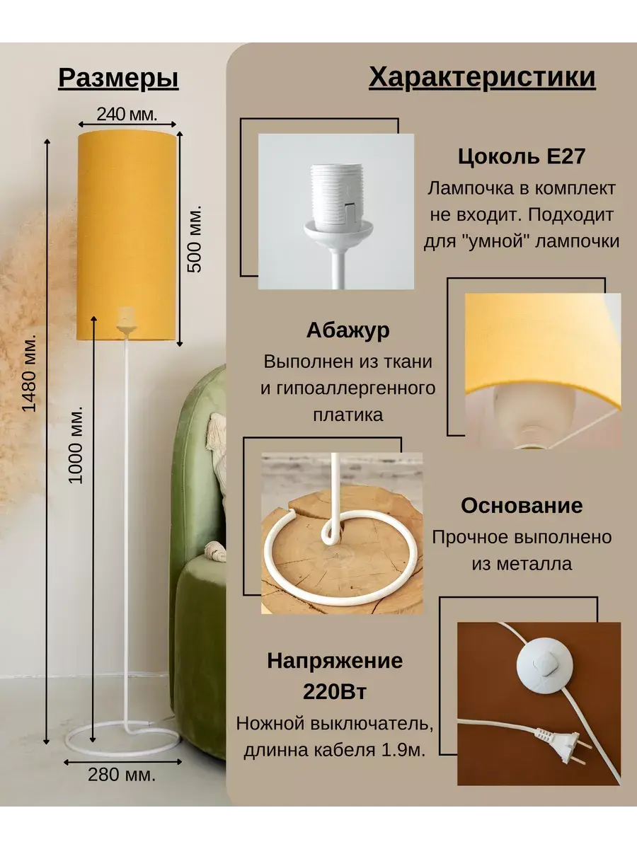 Стильный и современный торшер с лаконичным абажуром и высокими ножками бренда Пермский свет идеально подойдет для вашей гостиной или спальни. Поможет создать уют, станет дополнительным источником освещения и просто красивым декоративным предметом в оформлении интерьера в вашем доме. Купите его как подарок для женщин и девушек на 8 Марта или украсьте свою комнату в стиле лофт или модерн с помощью этого красивого светильника. Изделие ручной работы выполнено на нашем собственном производстве - фабрике, осуществляющей строгий контроль качества на каждом этапе изготовления. Абажур торшера изготовлен из безопасных, экологически чистых и гипоаллергенных материалов: термостойкой светотехнической пленки российского производства и износостойкой ткани премиум-качества. Торшер имеет ножной выключатель на проводе с вилкой. Длина сетевого шнура 1,9 метра. Этот напольный светильник с классическим дизайном в горчичном цвете станет отличным декоративным элементом в вашем интерьере и подойдет и для мужской, и для женской комнаты. Его длинная изящная форма сделает его вашим любимым дополнением для домашнего оформления декора. Он оснащен простым и удобным управлением освещения с помощью переключателя с кнопкой, а его абажур из качественной ткани поможет создать уютную домашнюю атмосферу. Уникальная торшерная лампа с дизайнерским абажуром идеально подойдет для оформления интерьера в комнате в стиле минимализм или модерн. Ее основание из пластика и металла идеально сочетается с текстильным абажуром. Она выступает отличным дополнительным источником освещения во время чтения книг или занятия рукоделием. Это идеальный выбор для рабочего кабинета или детской комнаты в квартире. Установите ее у камина, дивана или кресла. Комнатное изделие также подходит для интерьерного оформления дачи. Изделие удобное и практичное для использования. Модель тренога - это настоящая классика, которая станет украшением любого помещения. Проводной светильник работает от сети питания и подключается в обычную розетку. Для него подойдут любые светодиодные лампочки с цоколем Е27 (приобретаются отдельно). Изделие станет отличным подарком вашим родным и друзьям: родителям - маме с папой или дедушке с бабушкой. У нас есть акции и распродажи, вы можете купить наши товары в подарок или со скидкой!
