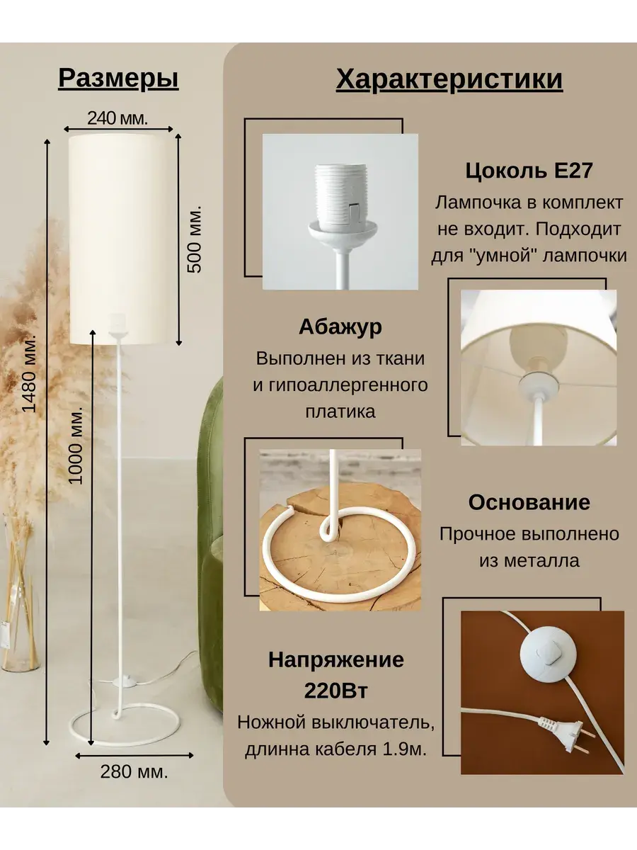 Стильный и современный торшер с лаконичным абажуром и высокими ножками бренда Пермский свет идеально подойдет для вашей гостиной или спальни. Поможет создать уют, станет дополнительным источником освещения и просто красивым декоративным предметом в оформлении интерьера в вашем доме. Купите его как подарок для женщин и девушек на 8 Марта или украсьте свою комнату в стиле лофт или модерн с помощью этого красивого светильника. Изделие ручной работы выполнено на нашем собственном производстве - фабрике, осуществляющей строгий контроль качества на каждом этапе изготовления. Абажур торшера изготовлен из безопасных, экологически чистых и гипоаллергенных материалов: термостойкой светотехнической пленки российского производства и износостойкой ткани премиум-качества. Торшер имеет ножной выключатель на проводе с вилкой. Длина сетевого шнура 1,9 метра. Этот напольный светильник с классическим дизайном в белом цвете станет отличным декоративным элементом в вашем интерьере и подойдет и для мужской, и для женской комнаты. Его длинная изящная форма сделает его вашим любимым дополнением для домашнего оформления декора. Он оснащен простым и удобным управлением освещения с помощью переключателя с кнопкой, а его белый абажур из качественной ткани поможет создать уютную домашнюю атмосферу. Уникальная торшерная лампа с дизайнерским абажуром идеально подойдет для оформления интерьера в комнате в стиле минимализм или модерн. Ее основание из пластика и металла идеально сочетается с текстильным абажуром. Она выступает отличным дополнительным источником освещения во время чтения книг или занятия рукоделием. Это идеальный выбор для рабочего кабинета или детской комнаты в квартире. Установите ее у камина, дивана или кресла. Комнатное изделие также подходит для интерьерного оформления дачи. Изделие удобное и практичное для использования. Модель тренога - это настоящая классика, которая станет украшением любого помещения. Проводной светильник работает от сети питания и подключается в обычную розетку. Для него подойдут любые светодиодные лампочки с цоколем Е27 (приобретаются отдельно). Изделие станет отличным подарком вашим родным и друзьям: родителям - маме с папой или дедушке с бабушкой. У нас есть акции и распродажи, вы можете купить наши товары в подарок или со скидкой!