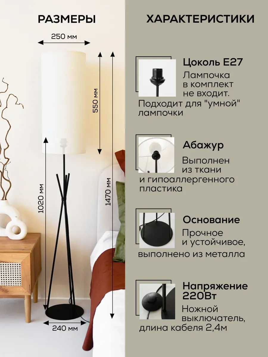 Стильный и современный торшер с лаконичным абажуром и высокими ножками бренда Пермский свет идеально подойдет для вашей гостиной или спальни. Поможет создать уют, станет дополнительным источником освещения и просто красивым декоративным предметом в оформлении интерьера в вашем доме. Купите его как подарок для женщин и девушек на 8 Марта или украсьте свою комнату в стиле лофт или модерн с помощью этого красивого светильника. Изделие ручной работы выполнено на нашем собственном производстве - фабрике, осуществляющей строгий контроль качества на каждом этапе изготовления. Абажур торшера изготовлен из безопасных, экологически чистых и гипоаллергенных материалов: термостойкой светотехнической пленки российского производства и износостойкой ткани премиум-качества. Торшер имеет ножной выключатель на проводе с вилкой. Длина сетевого шнура 1,9 метра. Этот напольный светильник с классическим дизайном в черном цвете станет отличным декоративным элементом в вашем интерьере и подойдет и для мужской, и для женской комнаты. Его длинная изящная форма сделает его вашим любимым дополнением для домашнего оформления декора. Он оснащен простым и удобным управлением освещения с помощью переключателя с кнопкой, а его белый абажур из качественной ткани поможет создать уютную домашнюю атмосферу. Уникальная торшерная лампа с дизайнерским абажуром идеально подойдет для оформления интерьера в комнате в стиле минимализм или модерн. Ее основание из пластика и металла идеально сочетается с текстильным абажуром. Она выступает отличным дополнительным источником освещения во время чтения книг или занятия рукоделием. Это идеальный выбор для рабочего кабинета или детской комнаты в квартире. Установите ее у камина, дивана или кресла. Комнатное изделие также подходит для интерьерного оформления дачи. Изделие удобное и практичное для использования. Модель тренога - это настоящая классика, которая станет украшением любого помещения. Проводной светильник работает от сети питания и подключается в обычную розетку. Для него подойдут любые светодиодные лампочки с цоколем Е27 (приобретаются отдельно). Изделие станет отличным подарком вашим родным и друзьям: родителям - маме с папой или дедушке с бабушкой. У нас есть акции и распродажи, вы можете купить наши товары в подарок или со скидкой!