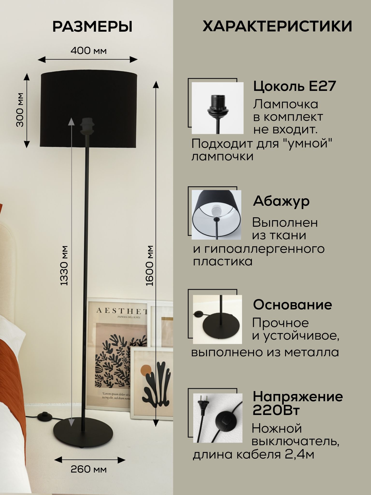 Основание металл, Абажур-цилиндр изготовлен из экологически чистых, гипоаллергенных материалов: износостойкая ткань, выключатель на проводе.