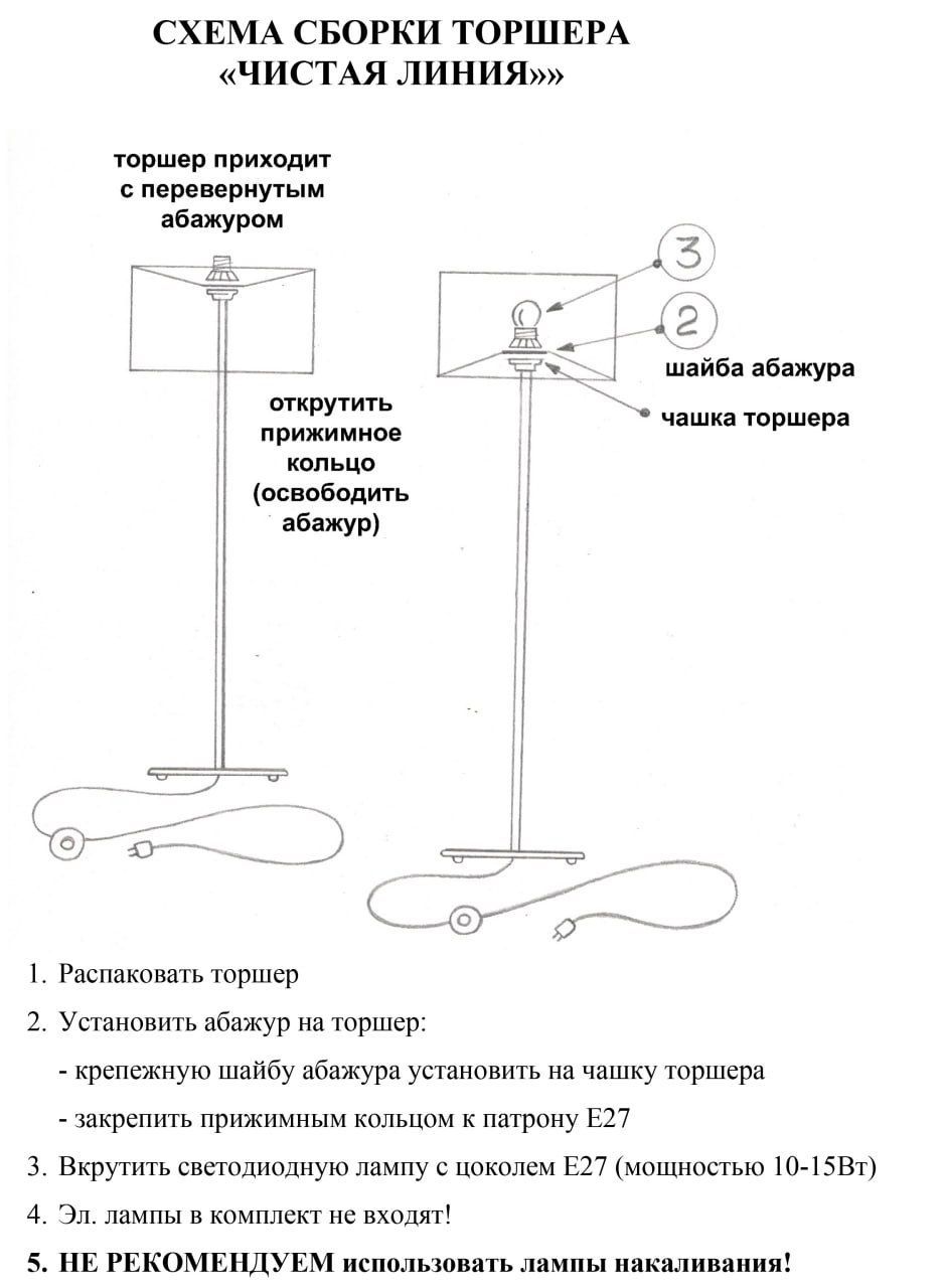 Не забудьте приобрести в напольный торшер лампочки! Они продаются отдельно. К лампе напольной подходят любые светодиодные лампы с указанным в характеристиках товара типом цоколя.